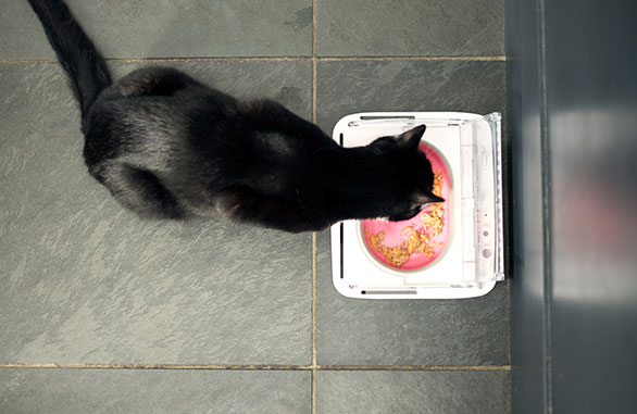 A tampa fecha a tigela vedada quando o animal se afastaEla continua fechada até a próxima vez que seu animal se aproximar
